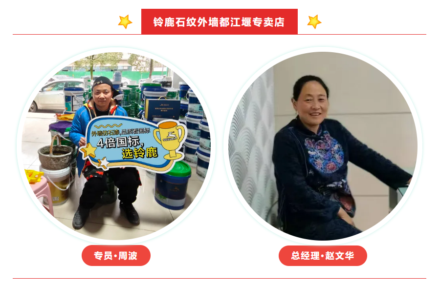 在赵文华经理带领下,经过2年的发展,我们铃鹿在都江堰地区已经有了一定知名度,发展势头良好。通过不断的宣传和科普,业主也纷纷认同“4倍国标选铃鹿”这个理念,在选择产品中也更为看重检测报告,在当地建立了一定的口碑。2024年,我愿再接再厉、更上一层楼,在都江堰地区打出铃鹿更大的知名度,争取成为外墙仿石漆领头羊。