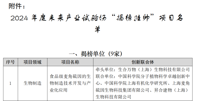 2024年6月19日,在2024年度上海市未来产业试验场“揭榜挂帅”评选公示中,生物制造领域的“食品级麦角硫因的生物制造技术开发与产业化应用”项目成功揭榜,该项目由生合万物(上海)生物科技有限公司作为牵头单位,中国科学院分子植物科学卓越创新中心、中国科学院上海有机化学研究所、上海麦角硫因生物科技集团有限公司、昇合建物(上海)生物科技有限公司作为联合单位。
