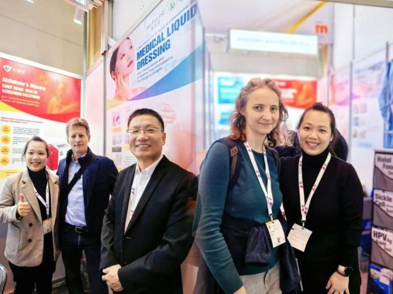他们拿着医用修复敷料和医用妊娠纹修复敷料,反复查看产品的包装和说明书,对产品的品质和功效给予了高度评价,还询问了购买渠道和价格等信息。通过现场面对面对话交流,进一步加深了与来访者的情感友谊,为后续的深度合作打下坚实基础。