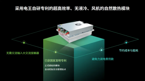 自然散热超充采用了电王自研专利的超高效率自然散热模块,无需液冷、无需空调、无需大功率风机,即可实现低损高效运行。该技术还获得了模块自动控制无功管理技术,无需大交流接触器,避免力调电费罚款。