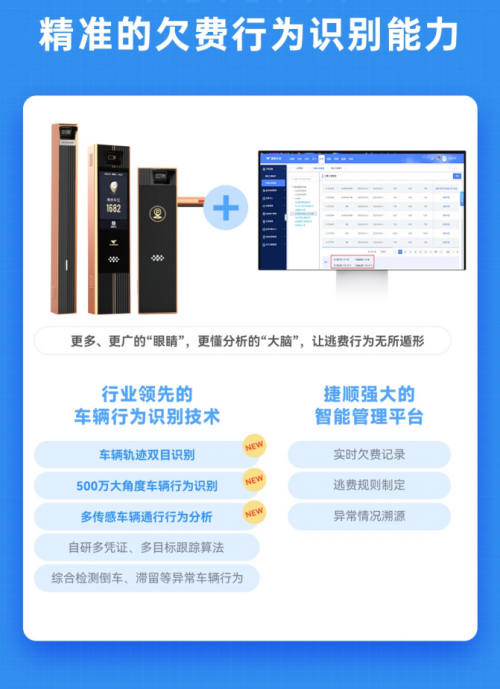 为了更全方位保障车场的收益,捷顺科技对车场防逃费方案中的车辆行为识别技术、欠费追缴方式进行了全面升级: