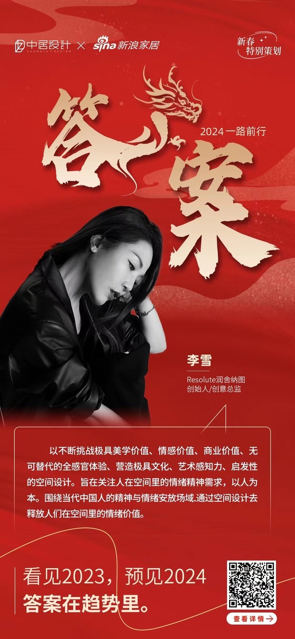 在“答案—2024一路前行”活动,Resolute润舍纳图创始人/创意总监李雪阐述了2024年行业的发展趋势:以不断挑战极具美学价值、情感价值、商业价值、无可替代的全感官体验、营造极具文化、艺术感知力、启发性的空间设计。旨在关注人在空间里的情绪精神需求,以人为本。围绕当代中国人的精神与情绪安放场域.通过空间设计去释放人们在空间里的情绪价值。