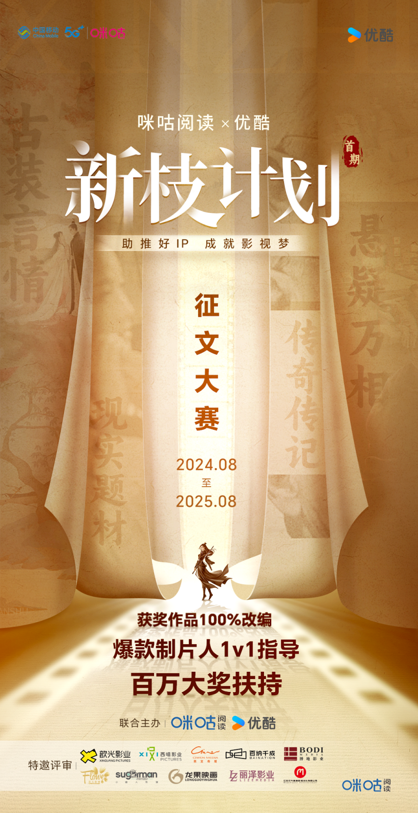 此外,自2024年9月起,咪咕阅读联合优酷开启首期“新枝计划”影视征文大赛,赛事持续至2025年8月。该计划面向全社会公开征集优秀网文作品,旨在挖掘优质文学IP和优秀创作者,实现文学与头部影视平台深度融合、共同发展,合力打造精品力作,为影视产业注入新鲜活力。
