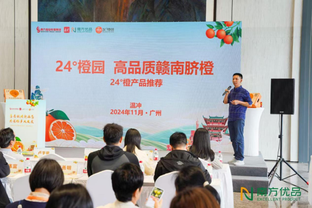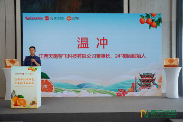 发布会上,温冲现场对公司及24°橙进行了详细介绍。江西天南智飞科技有限公司旗下的24°橙园品牌,因产自北纬24°区域的赣南寻乌而命名,这里属于全球优质脐橙最佳种植区域,也是中国赣南脐橙的核心产区之一,还是具有光荣革命传统的红色故土。
