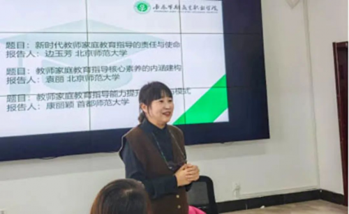杨冬梅从儿童发展理论前沿、家庭教育政策解读、教师家庭教育指导实践方法3方面和各位老师进行了分享和交流,她特别强调了家庭教育在现代教育体系中的核心地位,指出在婴幼儿教育、学前教育、体育教育及美术教育等多个领域,学生不仅要掌握儿童能力培养的专业技能,更要具备与父母有效沟通的能力,引导家长认识到家庭教育的重要性。