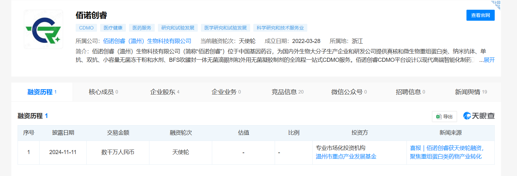 11月13日消息,近日,佰诺创睿(温州)生物科技有限公司(以下简称“佰诺创睿”)成功完成数千万元天使轮融资。本轮融资由专业市场化投资机构领投、温州基金跟投。据悉,佰诺创睿为温州市政府产业基金的首个直投项目。本轮融资将用于推动公司技术平台搭建及商业化推广,加速公司在重组蛋白类药物领域的产业化进程。