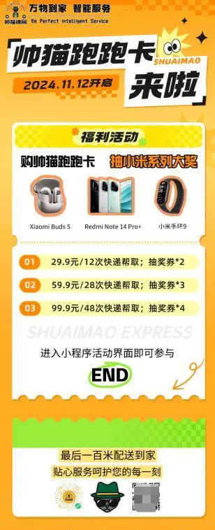 2024年11月12日,帅猫镖局新一轮回馈用户活动“帅猫跑跑卡 抽月度大奖”正式开启。