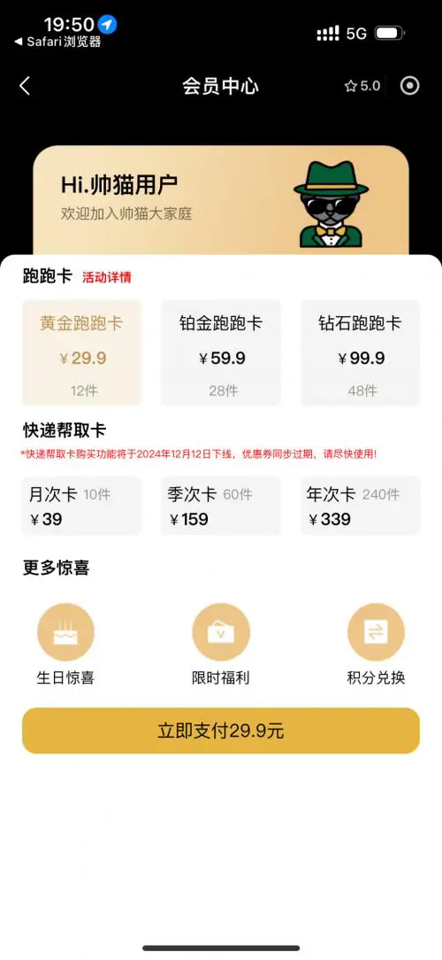 帅猫镖局的“帅猫跑跑卡 抽月度大奖”活动,不仅为用户提供了丰富的奖品,还通过会员系统升级,提升了用户体验。活动期间,用户可以通过参与“帅猫跑跑卡”活动,享受更多优惠和便利。