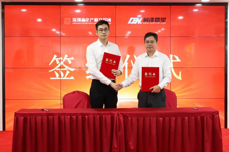 在领导与嘉宾的见证下,深圳文交所总经理助理肖芳雷与北京利泽嘉星科技有限公司董事长焦智鸿共同签署合作协议。