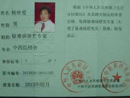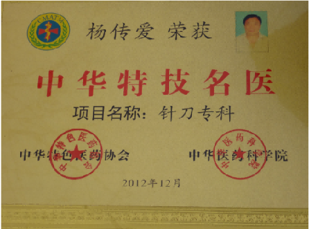 杨传爱,中华特技名医,高级针推师,健康管理师,中医高级讲师、北京四知堂国际医学研究院院长,杨氏痔疮无痛注射新疗法的创始人。毕业于安徽中医药大学、先后在中国中医药研究院、北京协和医院等地进修学习,后从师于中国十大功勋针刀专家朱国庆教授、中国中医科学院韩广军教授、武汉科盾生殖健康医院戚玉才教授等。现为北京世针联埋线专家委员会委员、北京名医名方特约研究员、中华针刀医师学会会员、武汉性健康研究会会员、国医网健康顾问委员会委员、世界中医联盟会中医国际大舞台专职讲师、海峡两岸医药卫生交流协会中医药专业委员会客座教授等。被中华人民共和国卫生部、中国中医药研究促进会、国家医学教育发展中心以及中华特色医药协会与中华医药科学院分别授予“国家级疑难病研究专家”、“特色诊疗医学专家”和“中华特技名医”称号。有多篇医学论文获“全国优秀论文二等奖”和“中医药特色诊疗成果奖”,并被中国第一医学网站《国医网》、《中国科技新闻网》、《科技文摘报》、《实用疼痛学杂志》、《全国临床医学百科论坛》、《中国民族医药特色诊疗技术大全》、《创新成果与卓越人物》、《中国好医生》和《医圣张仲景经方临床应用大典》等网站、杂志和书入编,并担任《中国好医生》副主编,其《医圣张仲景经方临床应用大典》在南阳张仲景博物馆永久典藏。2014年在全国民间医学比武大赛中获“针法组三等奖”和“特殊荣誉奖”,2015年十月在人民大会堂召开的第十二届中国科学家论坛大会上被授予“2015年度中国科技创新先进个人”,专利技术“一种无痛注射治疗痔疮的新疗法”被评为2015年度中国科技创新最佳发明技术,受到前卫生部长高强的亲切接见。
