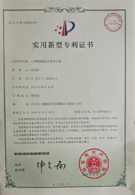 该疗法采用特效高分子药物经下肢静脉定位介入,使曲张静脉血管内纤维细胞瞬间产生无菌性化学性炎症,使纤维细胞迅速粘连闭合,疤痕形成最后达到血管闭锁,使曲张的静脉平缓消失。与此同时,侧支循环也逐渐建立,改善并恢复了对肢体的血液供应,达到了彻底治愈下肢静脉曲张的目的。如果曲张的静脉直径超过0.8cm,又直通到大腿上,这时就需要微创结扎一下血管(杨氏静曲治疗器,专利号:201721023934.2)。