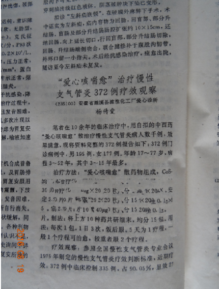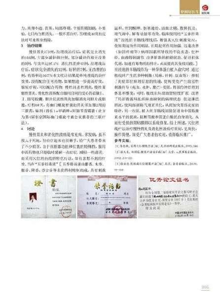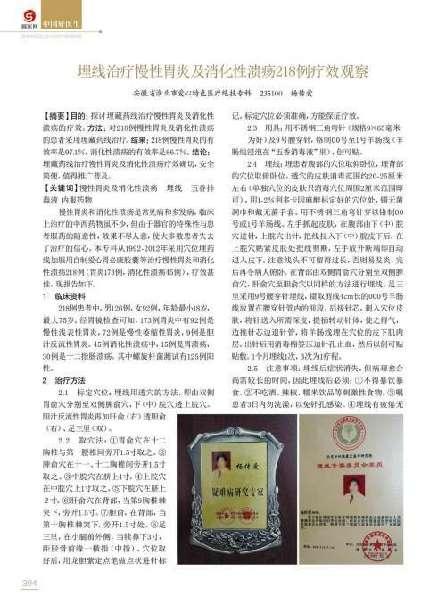 针对这种常见的疑难杂症,杨传爱及其科室从1992-2012年采用穴位埋药线加服用自制爱心胃必康胶囊等治疗慢性胃炎和消化性溃疡218例(胃炎173例,消化性溃疡45例),疗效甚佳。