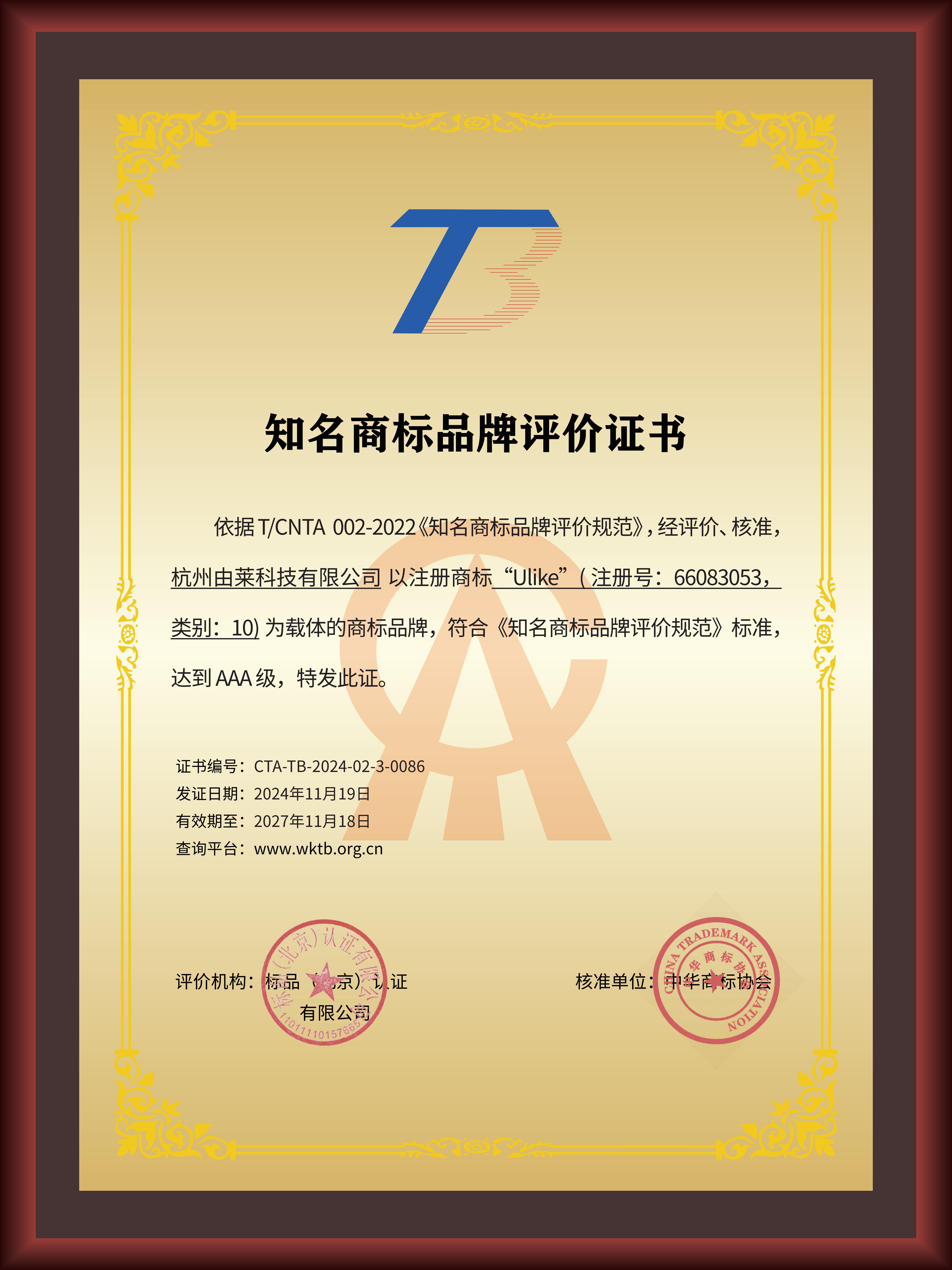11月22日,第十四届中国国际商标品牌节在西安国际会展中心举行。活动现场,Ulike被官方正式授予“知名商标品牌评价证书”,获评“AAA级知名商标品牌”。