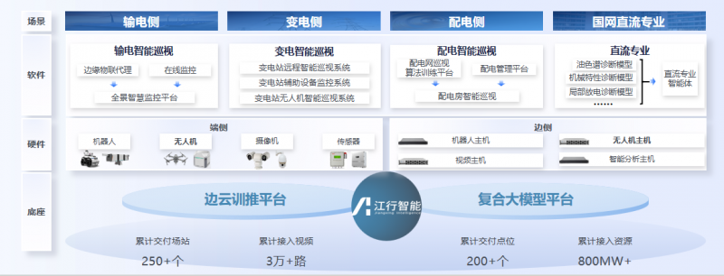 在演讲中,庞海天博士展示了江行智能在变电运维领域的核心成果——“输变配场景智能巡检一体化交付解决方案”。方案依托公司自主研发的边云训推平台和超百种行业算法,用智能化手段替代人工操作,实现全站综合智能管控,成功构建满足电力行业多样化应用场景的智能巡视产品矩阵。