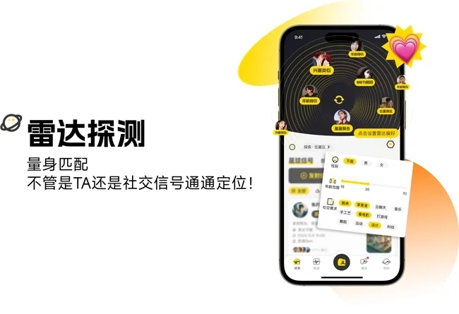 人与人之间的匹配,首页雷达功能,利用用户画像、多路召回算法、排序算法、语义检索、千人千面等AI技术将个人属性转化成标签,精准高效的将同一标签下的人匹配在一起。同时也用智能推荐算法进行人和社交需求之间的匹配,精准推送用户感兴趣的社交需求(信号)和内容(电波),从而加速社交需求的回应,促进社交活动的进行。在发射星球信号时,(通过语音发布解析表单功能):实体识别技术进行语音发布信号,增加发布的快捷性。