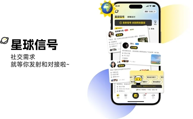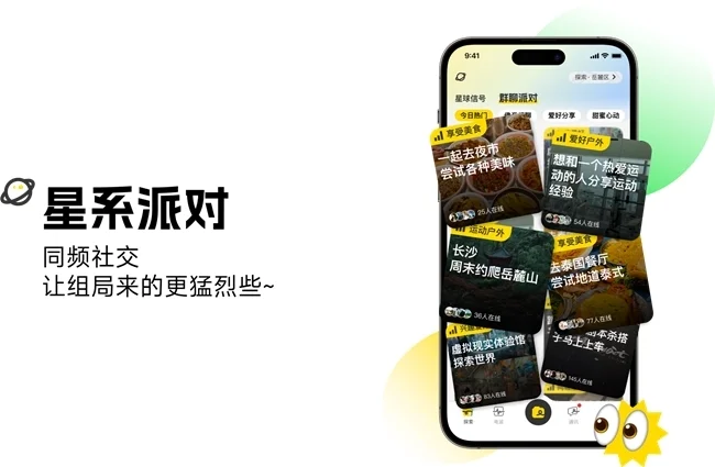 更能与志同道合的人组成兴趣群,在群聊里做各种兴趣交流,还可在群内发送星球信号和电波迅速找到同频组局搭子,即星系派对,同样的,作为社交宇宙的一颗星球,也能接收信号、查看或互动电波,在星系派对畅聊。