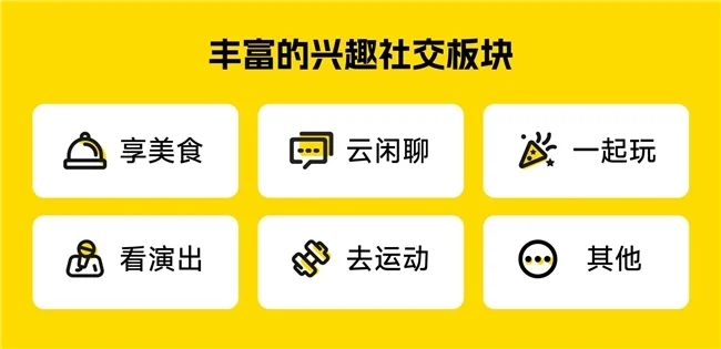识识当前推出6大热门社交板块,享美食、云闲聊、一起玩、看演出、去运动、其他。未来会向全社交领域去开发新板块,如宠物、亲子教育、职场等,这些社交板块产生的社交活动将流量导向线下。人是多样化的,也是复杂的,社交需求也必定跟着人的生活、情感需求在变化,而且会越来越多,越来越细化,识识会根据大数据,时时跟进。