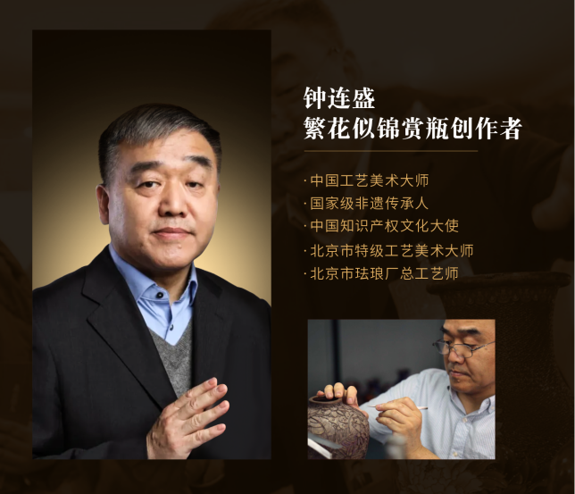 《繁花似锦酒》瓶身设计传承皇家艺术精髓,外坛由国家级景泰蓝非遗大师钟连盛亲自操刀,采用景泰蓝掐丝珐琅彩工艺精制而成。以皇家御用之器“梅瓶”为造型,融合繁花锦簇的华美图案,象征国泰民安、繁荣昌盛。每一外坛皆由工匠纯手工打造,是文化瑰宝与艺术精品的完美结合,尽显皇家威仪与高贵风范。