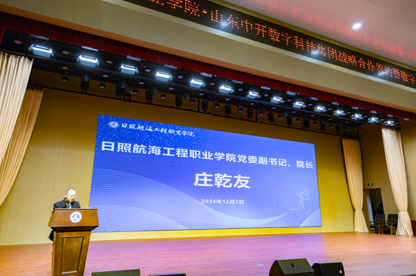庄乾友院长详细介绍了日照航海工程职业学院发展情况,他强调,在数字经济快速发展的背景下,校企合作成为了连接教育链、人才链与产业链、创新链的关键纽带,是实现“城市+大学”协同发展的重要一环,对于提升职业教育质量、推动产业升级具有至关重要的作用。学院与山东中开数字科技集团的合作,是双方战略合作的重要成果。未来,双方将紧密围绕数字经济产业的发展需求,不断优化专业设置,更新课程体系,并加大实践教学的力度,以推动产学研的深度融合。通过共建实训基地、开展联合科研攻关、举办行业论坛等多种形式,双方将实现教育资源与产业资源的有效整合,为学生搭建起一座从校园顺利过渡到职场的无缝对接平台。
