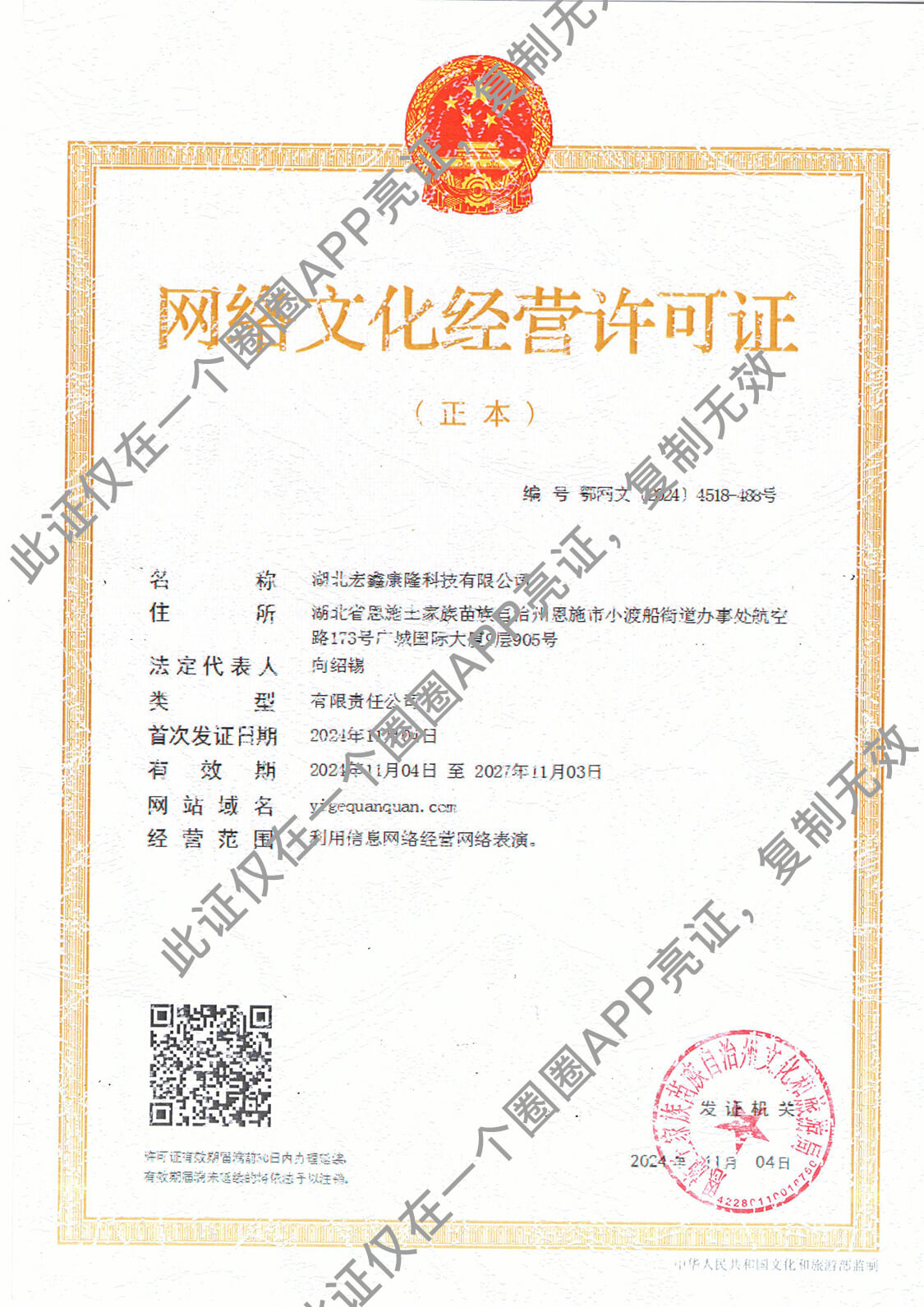 网络文化经营许可证的获得,意味着湖北宏鑫康隆科技有限公司正式具备了经营网络文化业务的合法资质,可以依法合规地在全国范围内开展网络表演等活动。这将为湖北宏鑫康隆科技有限公司进一步拓宽数字互联网业务模式、提升数字服务质量、构建数字应用生态提供有力支持。