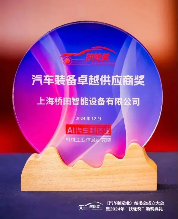 12月10日,2024年扶轮奖颁奖典礼在上海金陵紫金山大酒店举行,桥田智能设备有限公司获2024扶轮奖“汽车装备卓越供应商奖 ”荣誉称号。桥田智能市场部负责人张苏娜出席本次颁奖仪式。