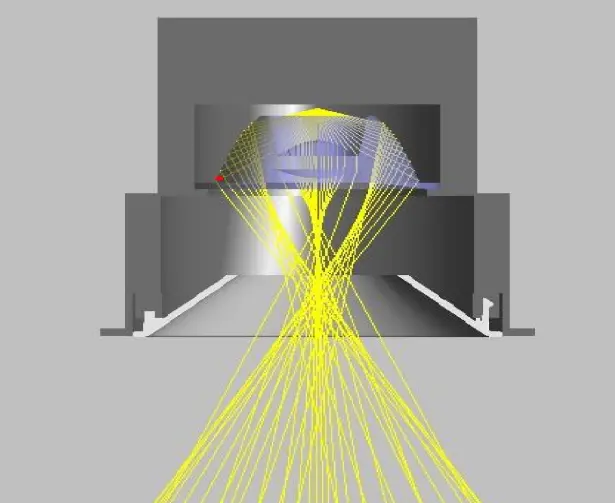 在光学方面,并未采用市场流通的透镜+小孔遮光罩,以此来控制眩光,而是利用光学结构通过特定的反射与折射的设计,加上特定的灯具结构来控制眩光,这种设计可以避免光斑中心点曝光与光色统一的问题,同时也能避免由于光的温度过高,导致小孔遮光罩变形、熔掉与透镜变色的安全问题。