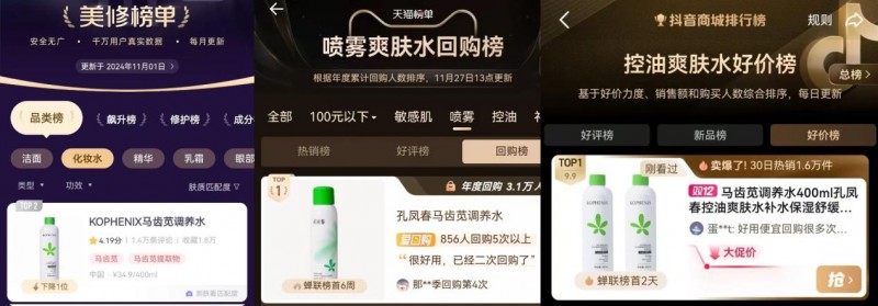 具体来看,孔凤春旗下的明星产品在各个细分领域都展现出了不俗的表现。旗下的马齿苋调养水和马齿苋舒缓特护霜两大爆款产品展现出了强大的市场影响力。其中,马齿苋调养水在“天猫榜单-喷雾爽肤水回购榜”上连续6周蝉联榜首、在“抖音商场榜单-控油爽肤水好价榜”中蝉联榜首2天、在“美修榜单-化妆水品类”中荣登第2名。