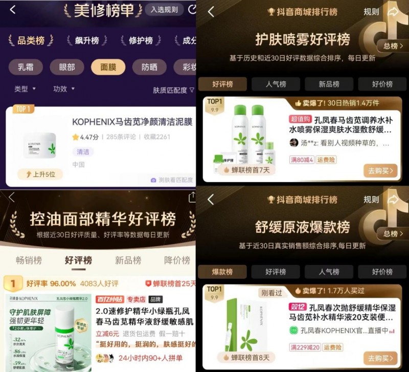 除了以上几款备受消费者青睐的产品之外,在美修平台上,孔凤春马齿苋净颜清洁泥膜荣登面膜品类榜单第1名;在抖音商城排行榜上,孔凤春马齿苋舒缓修护喷雾在“护肤喷雾好评榜”上蝉联榜首7天、孔凤春马齿苋次抛精华液则在“舒缓原液爆款榜”中登上了第1名;在拼多多“控油面部精华好评榜”中,孔凤春马齿苋舒缓特护精华液连续25天占据榜首位置。