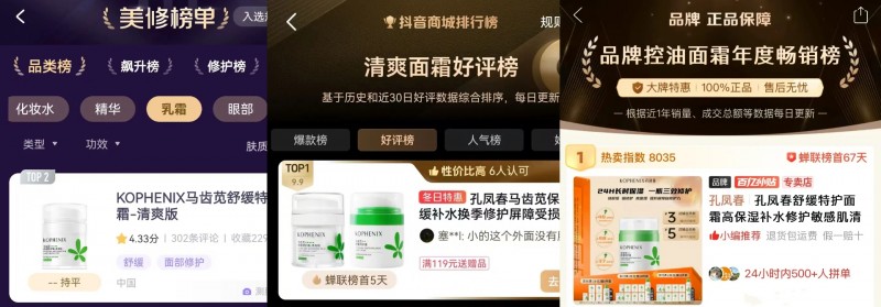 而孔凤春马齿苋舒缓特护霜在各大平台同样表现亮眼,不仅在“美修榜单-乳霜品类”荣登第2名,还在”抖音商场排行榜-清爽面霜好评榜”上连续5天占据榜首位置,更值得一提的是,在“拼多多-品牌控油面霜年度畅销榜”上,该特护霜蝉联榜首长达67天,其市场受认可程度可见一斑。