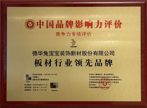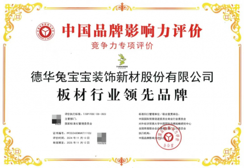 品牌影响力是企业开拓市场、占领市场的重要因素。近日,在备受瞩目的中国品牌影响力评价活动中,兔宝宝凭借卓越的产品品质、贴心的服务以及广泛的市场认可度,荣膺“板材行业领先品牌”奖项!