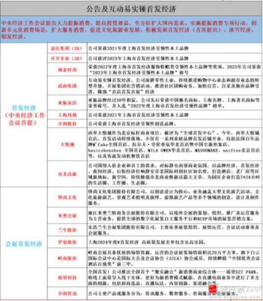 中央经济工作会议12月11日至12日在北京举行。会议提出大力提振消费、提高投资效益,全方位扩大国内需求。实施提振消费专项行动,创新多元化消费场景,扩大服务消费,促进文化旅游业发展。积极发展首发经济(首次提出)、冰雪经济、银发经济。