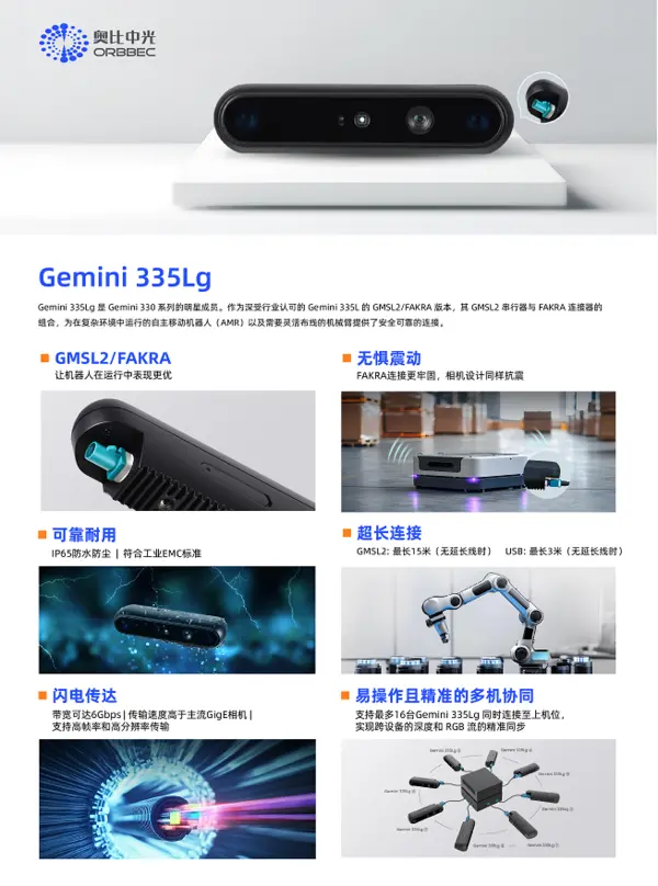 “眼睛”则是采用奥比中光的新一代全场景双目3D相机Gemini 335Lg。该相机凭借GMSL2串行器与FAKRA连接器的完美结合,为在复杂环境中作业的自主移动机器人(AMR)及需灵活布线的机械臂提供了安全可靠的连接,从而赋予了机器人更加清晰且精确的视觉感知能力。