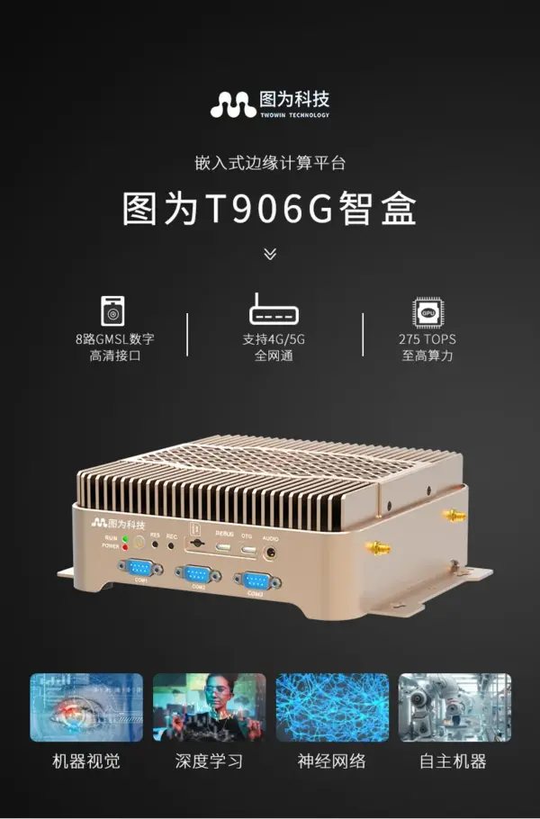 此方案“大脑”采用图为T906G边缘计算机,搭载英伟达Jetson AGX Orin模组,AI算力高达200TOPS(最高配置可达275TOPS),宛如智慧中枢神经,确保视觉信息瞬间畅达无滞,为机器人决策与行动争取关键“零时差”。