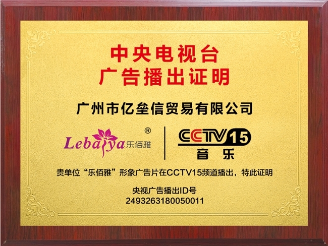CCTV作为我国高权威、高公信、高覆盖、高影响的国家级电视媒体,其影响力触达全国将近14亿人口,是国内含金量相当高的传播平台,一直以来在消费者心目中有着很强的影响力和公信力。经过多次调查审核,凭借出色品质和实力,“乐佰雅”不负众望,以良好的企业形象、卓越的产品品质、过硬的产品口碑顺利通过层层审核,才允许被播出,荣幸登录CCTV频道进行品牌展播。一方面充分体现了“乐佰雅”雄厚的实力与底气,另一方面也体现了其对自身产品的充分自信以及对未来前景发展有着十足信心。