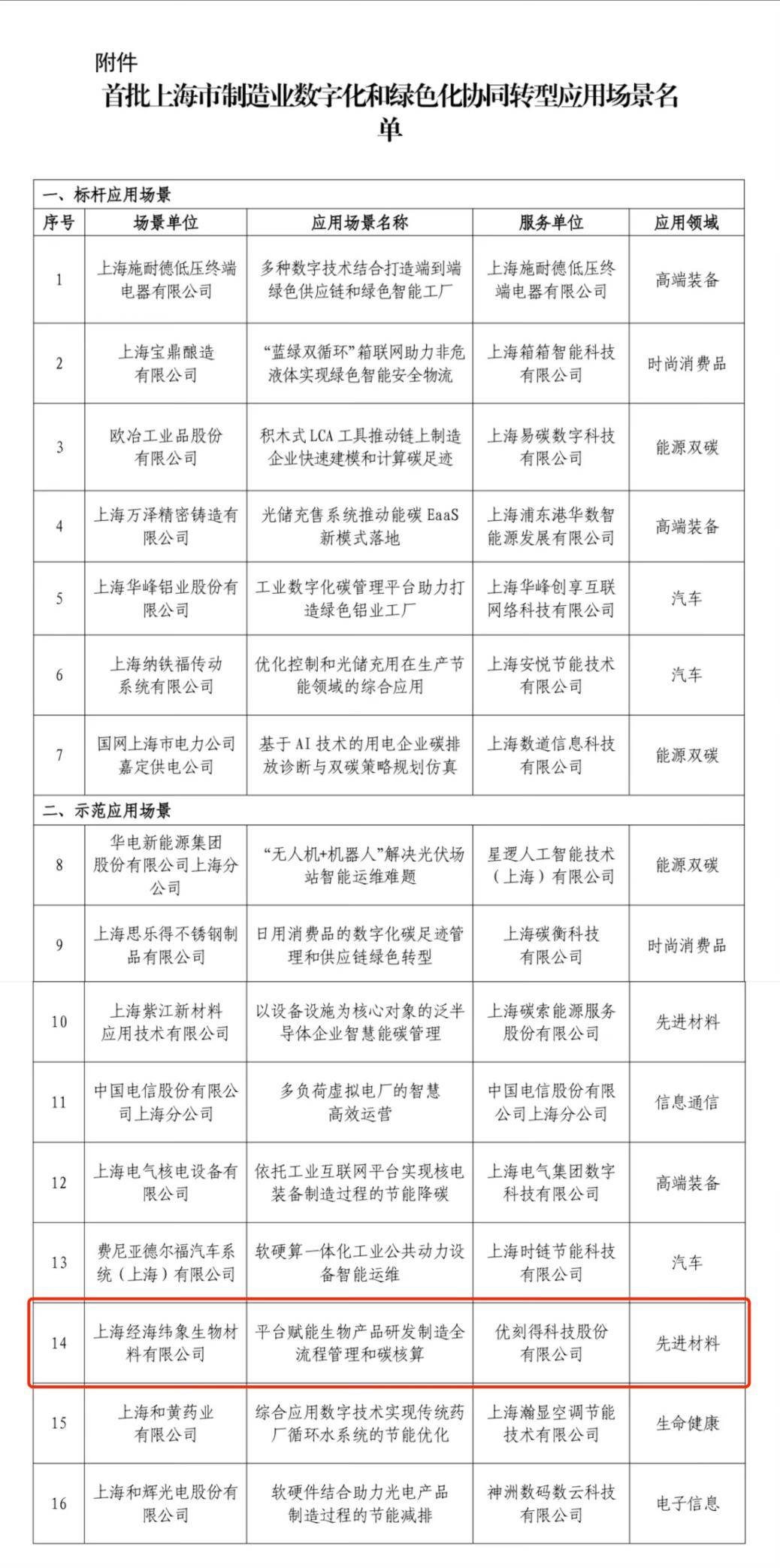 近日,上海市经信委发布首批上海市制造业数字化和绿色化协同转型应用场景名单。优刻得与战略合作伙伴上海经海纬象生物材料有限公司(以下简称“经海纬象”)联合探索“生物智造创新管理平台”项目,该方案凭借对于“赋能生物产品研发制造全流程管理和碳核算”的场景价值,荣誉入选示范应用场景。