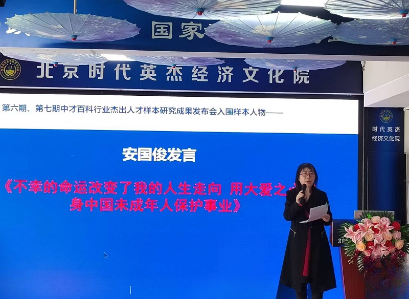 著名慈善公益人、普法志愿者,宇泽慈心项目发起人安国俊代表第六期、第七期杰出人才样本研究的入围人士发表了感言。她说,非常感谢中才百科杰出人才样本研究课题组专家的辛勤付出,入围全国未成年人保护领域人才样本研究,同时入围中国未成年人保护十大杰出人物、2024中国法治社会新闻十大热点人物有些出乎意料,虽然这不是一项荣誉,但是这项人才研究工作非常有意义、有价值,通过这项研究,找出每一个行业人才成长、发展的规律,作为公益课题向社会公布也具有一定的社会正向引导作用,对入围人士也是一种莫大的鼓励和鞭策,同时也是社会对我们这些在未成年人权益保护领域的公益人士人生价值与事业选择的一种肯定。我从一场交通事故的受害人家属到保护未成年人公益活动志愿者,连续6年坚持做保护儿童安全出行的活动数百场,直接间接影响数百万人以上,已经把保护儿童少年权益当成了一项长期坚守的事业。孩子是祖国的花朵和未来,希望社会各界更多的人士关注未成年人保护,共同推进我国未成年人保护事业,确保青少年良好的成长环境。同时,也希望中才百科杰出人才课题研究继续下去,通过对各个行业杰出人才样本研究,从而促进我国人才的健康成长与发展,为我国“科技兴国、人才强国”战略贡献力量,为中国知识分子的“家国情怀”作好精神支撑。