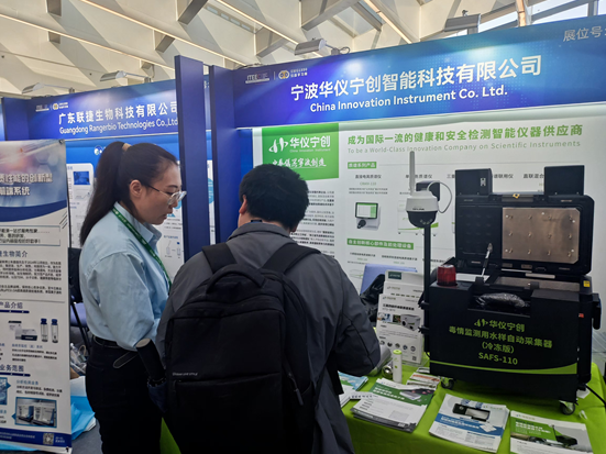 华仪宁创的直接电离质谱仪是本次展会上的明星展品。其采用自主知识产权的介质阻挡放电直接电离(DBDI)质谱技术,具备超高灵敏度,攻克传统小型化质谱技术领域难以实现的痕量物质微弱质谱信息的采集问题。该方案可以广泛应用于生物样品基质中痕量毒物毒品及代谢物的快速筛查和环境监测领域对微量污染物的检测等领域。并且直接电离质谱技术单个样本检测仅需数秒,可同时检测多种目标物,大大提高了筛查效率,满足了现场实时精准分析的市场需求。华仪宁创展台的另一个亮点:水样自动采样器SAFS-110是华仪宁创基于原创专利技术(ZL2024105985747)研发推出的水样自动采样器,该款设备可通过手机智能控制,实现小体积、高精度的水样采集。采集过程支持设置多样化采样模式,且采样器具备自动润洗管路功能,有效防止样本交叉污染。采样器内置可远程控制的冷藏存储箱,能将水样即采即冻,保证水样采集过程中水质不发生变化。目前,该款采样器已在国内多省市以及海外市场推广销售,取得了各领域专业用户认可。