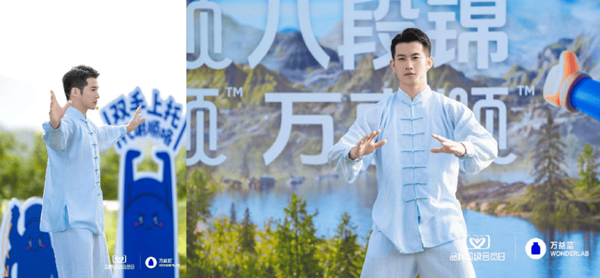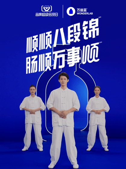 同期,万益蓝WonderLab在浙江湖州安吉举办“益起顺顺出行”自造节,为期十天的活动中,全新推出“顺顺八段锦”,试图融合益生菌与中式养生文化,打造“每日八段锦,饭后小蓝瓶”养生范式,为中老年健康开辟新径,引发热议。