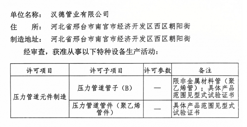 汉德管业有限公司取得压力许可 B 级证书,是一个新的起点,也是一份新的责任。我们将以此为契机,不断提升自身实力,为客户提供更加优质、可靠的管材管件产品。 让我们携手汉德管业,共同打造温暖、高效的热力传输新时代!选择汉德管业,就是选择品质,选择放心,选择未来!