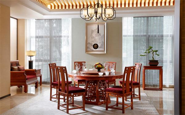 餐桌一般呈方形或圆形,将餐桌摆放在餐厅的中心位置,与四周环境相融合,亦有取意“正中人和”的说法。现在我们所见的中式椅子的形式,多为明清时代流传下来的款式,样式多,风格呈现简约与华丽两派。