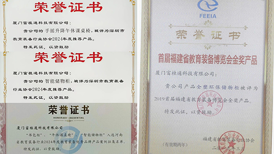 2024年,富桂通科技午休课桌椅、智能储物柜等产品先后入选河南省教育装备行业2024年度教育装备优秀品牌案例征集名单、深圳市教育装备行业协会2024年度推荐产品及深圳市教育装备行业协会2024年度推荐产品、第六届“白鹭杯”海峡工业设计大赛银奖、入选2024年度河南省教育装备创新成果名录……富桂通科技以切实行动与卓越匠心品质,稳步前行谱写着企业发展华章。