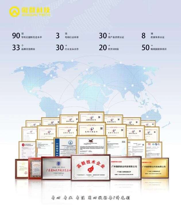 创新驱动,铸就品质。傲群科技旗下有工程技术研发中心,20年资深经验研发人员,与华南理工大学、暨南大学、佛山大学等高校共建实验室和开展产学研协同创新,掌握先进制刷技术、自动化设备,研发实力雄厚;主导业内8项团标、行标制订,参编1项国标。通过不断探索和突破,傲群科技成功研发出一套新型高性能毛刷智能制备工艺及技术,获101多项知识产权,通过IATF16949、ISO13485、ISO9001、ISO45001、ISO14001等8项管理体系认证,确保每一件产品达到最高品质,实现了根据客户需求定制化生产的灵活性。