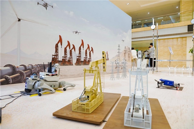 活动现场设立了具身智能解决方案展区,具体包括机器狗交互体验区、智能巡检模拟方案区、低空仿真方案区、机械臂采数操作区以及数字维修、数字能源模型算法方案区。