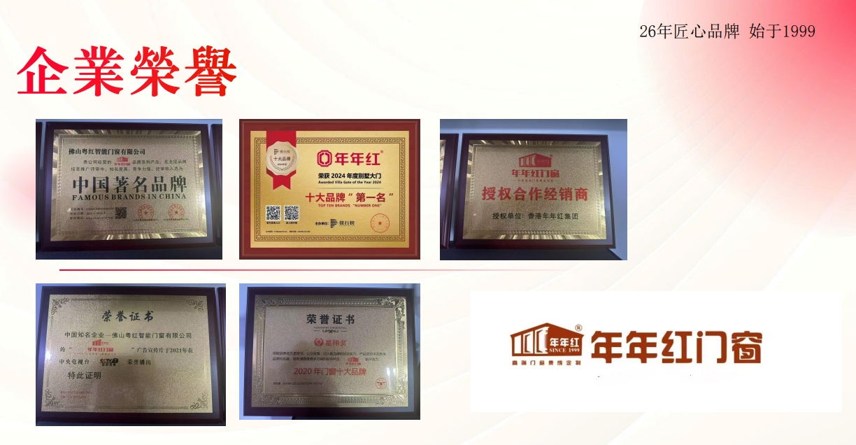 佛山粤红智能门窗有限公司,作为香港年年红集团在佛山的运营与生产主体,依托集团近三十年的积累与拓展,已发展成为涵盖别墅大门、安全门、厨具、门窗等多领域的综合性大型企业。其约40万平方米的宏大生产基地,见证了年年红门窗强大的制造实力与匠心精神。