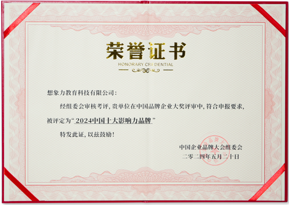 2024年5月,想象力教育科技荣获“2024中国十大影响力品牌”,想象力积极响应国家对智能化、数字化教育的号召,打造智能教育新生态。