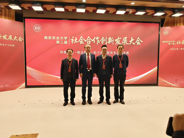 南京农业大学党委常委、副校长丁艳锋(左二),前沿交叉研究院院长窦道龙(右一),托普云农董事长陈渝阳(右二),智慧农业研究院院长朱旭华(左一)合影