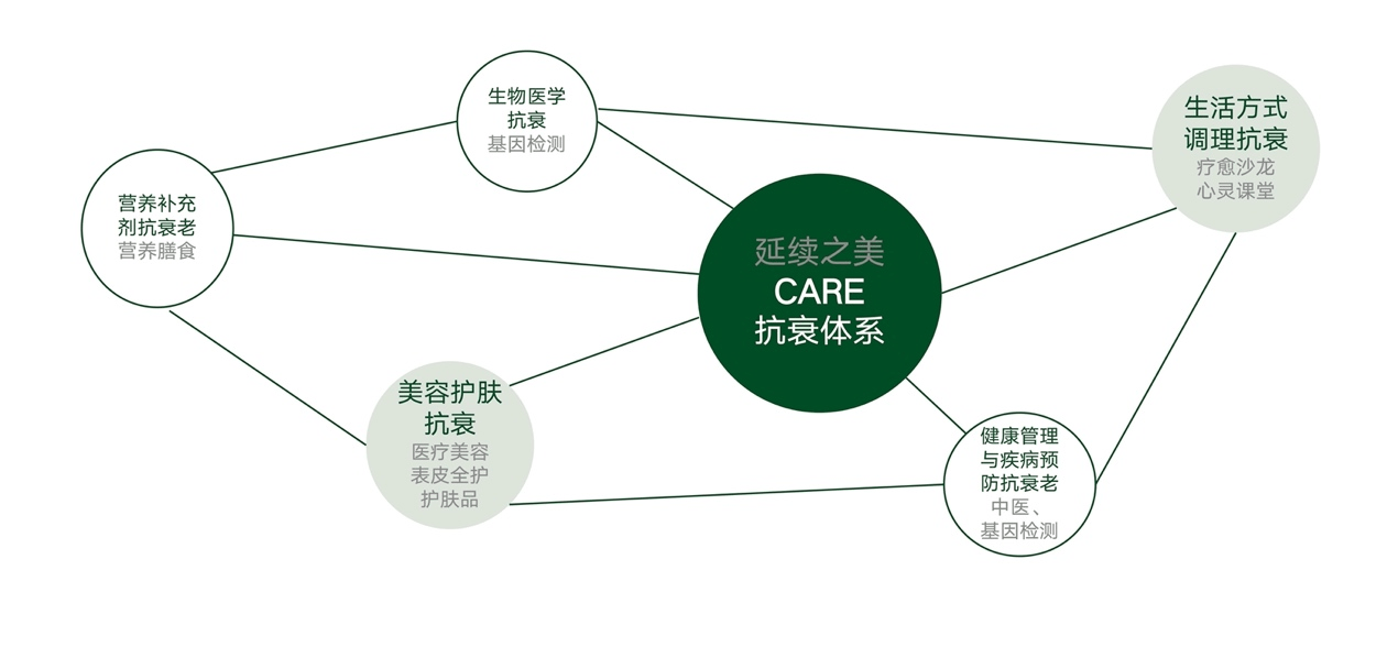 延续之美CARE抗衰体系,即Continous(持续) Anti-aging(抗老化) Regenerative (再生)Evaluation(评价)& Education system(教育体系),该体系涵盖了生物医学抗衰、营养补充剂抗衰老、美容护肤抗衰、健康管理与疾病预防抗衰老以及生活方式调理抗衰等多个方面。