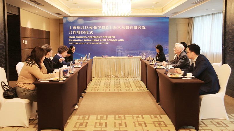 下午15点58分,签约仪式正式开始,上海松江区爱菊学校校长童立贤与未来教育研究院执行院长钱忠杰分别代表双方签署合作备忘录。