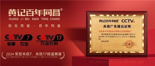 在茶行业的广阔天地里,总有一些品牌如熠熠星辰,凭借着深厚的底蕴和卓越的品质闪耀光芒。近日,云南百年同昌茶业有限公司昆明茶厂旗下的“黄记百年同昌”品牌,就迎来了品牌发展历程中的又一高光时刻——成功荣登中央广播电视总台CCTV - 7、CCTV - 17频道,开启了一场意义非凡的品牌展播之旅。