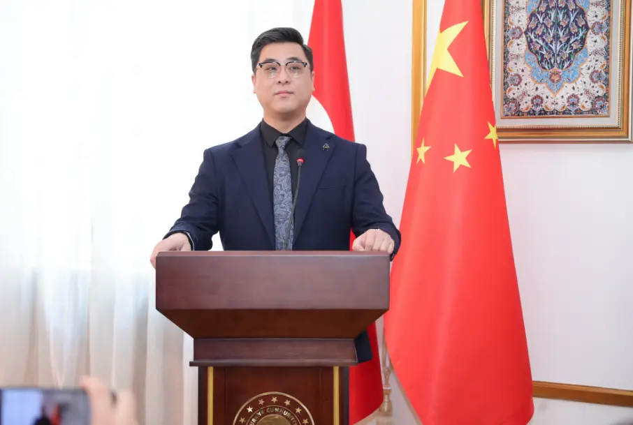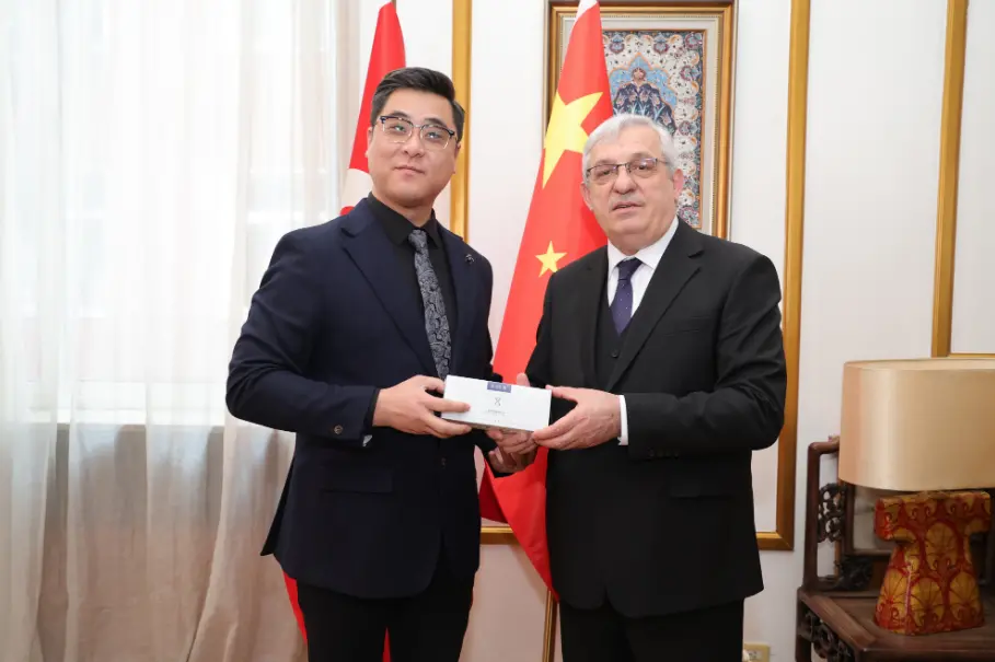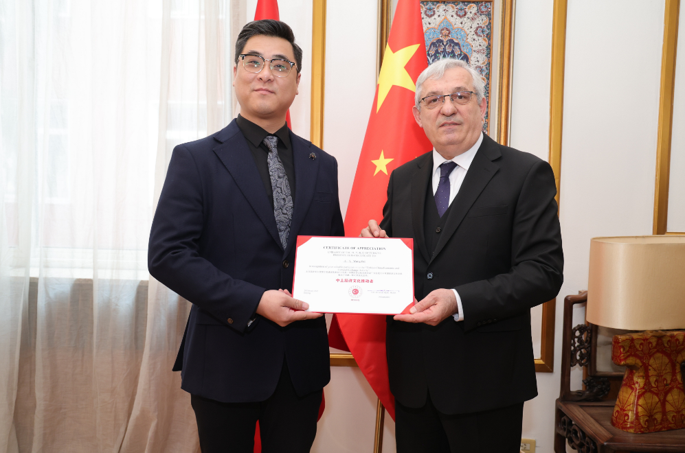 2025年2月28日,土耳其驻华大使馆举办了一场高规格的经贸交流活动,众美汇集团董事长王飞作为特邀嘉宾出席。此次活动旨在促进中土两国在经贸、科技等领域的深度合作,进一步推动双边关系发展。王飞董事长在活动中受到土耳其驻华大使穆萨的亲切接见,并被授予《中土经济文化推动者》称号,以表彰其在推动中土经济文化交流与合作中的卓越贡献。